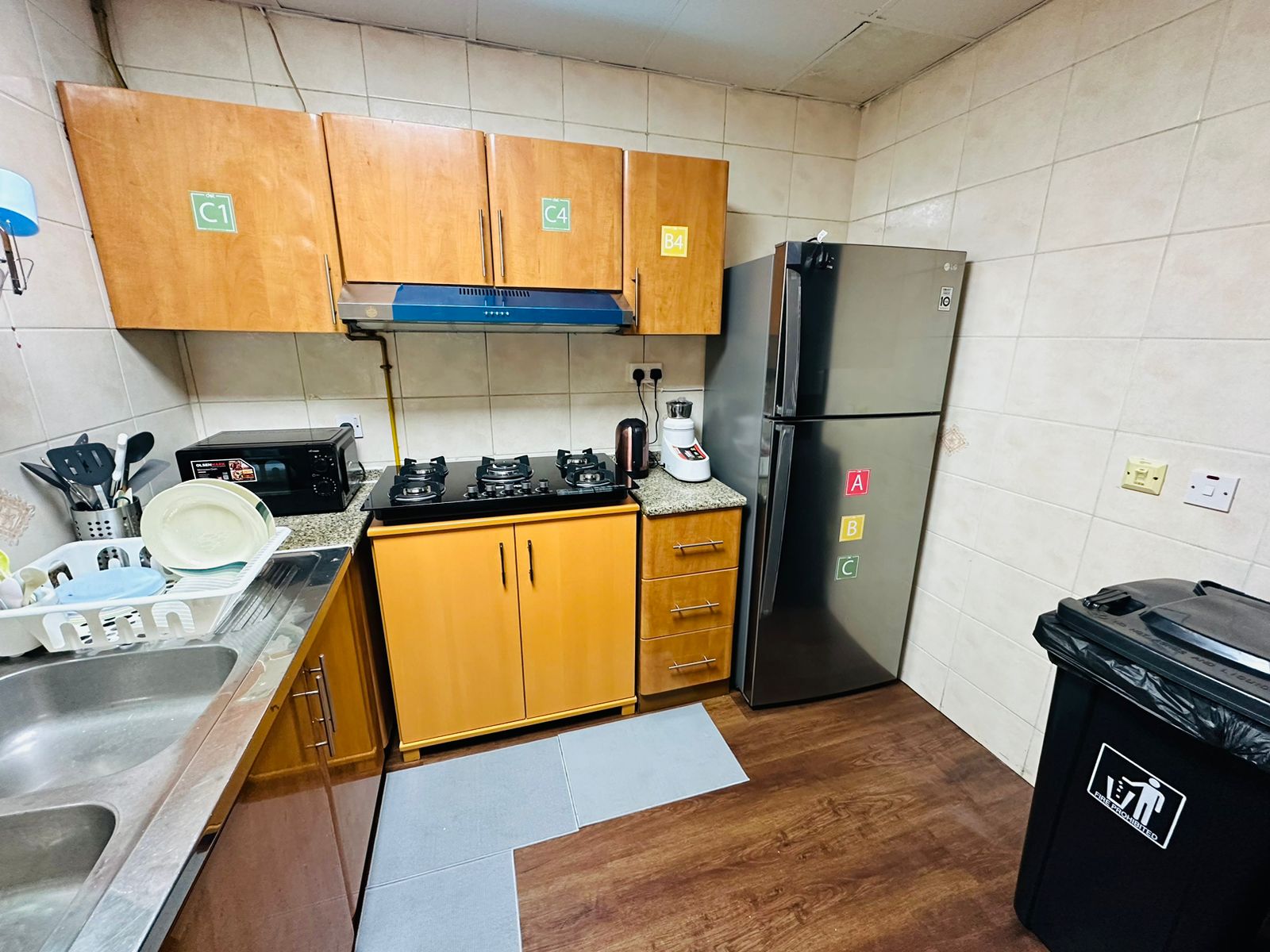 The apartment is fully equipped and has 5 standard privacy cabins with a shared washroom for 5 guests. AED 1100/- includes all costs and service charges, with no hidden fees, and includes the following amenities: