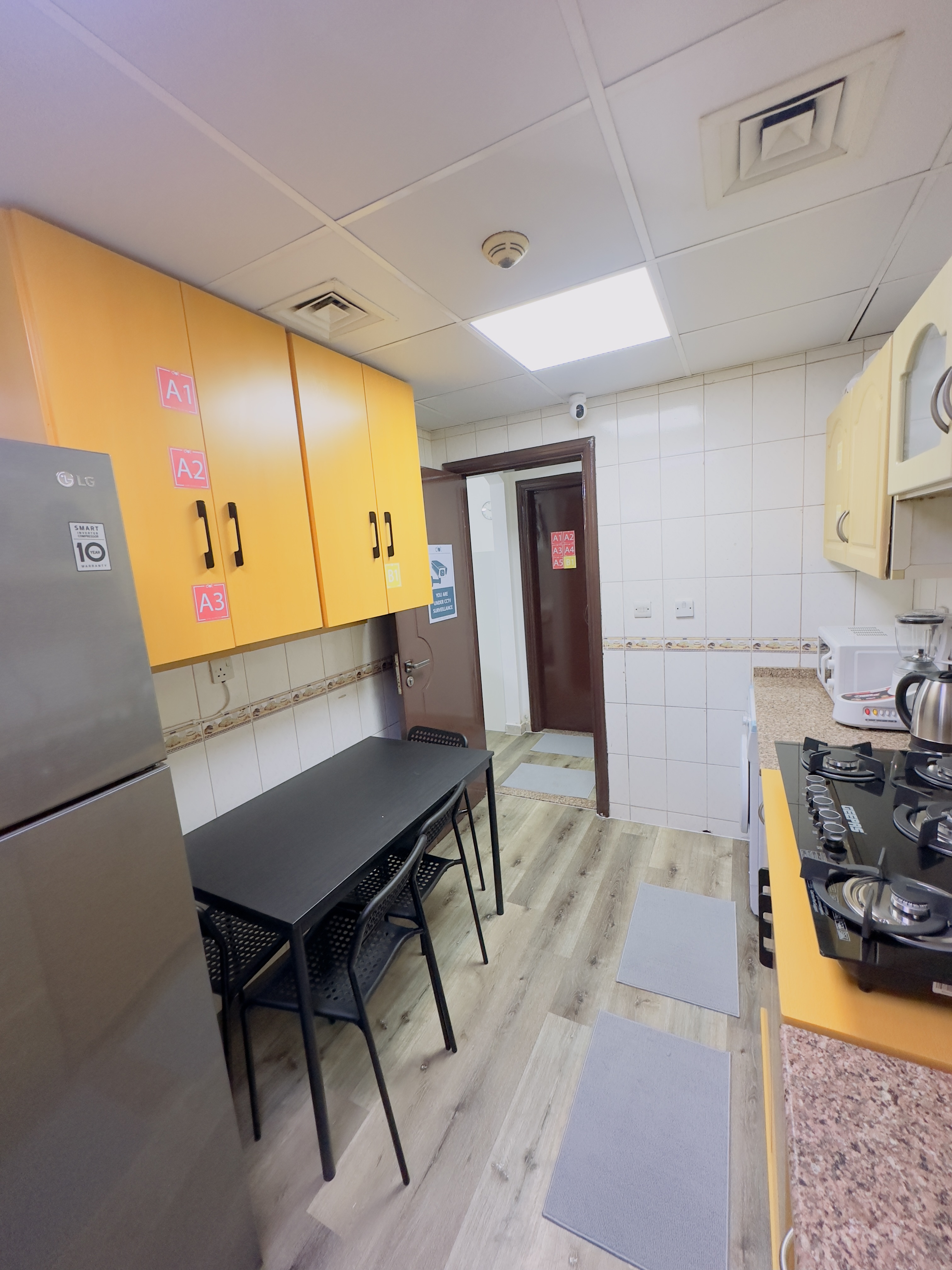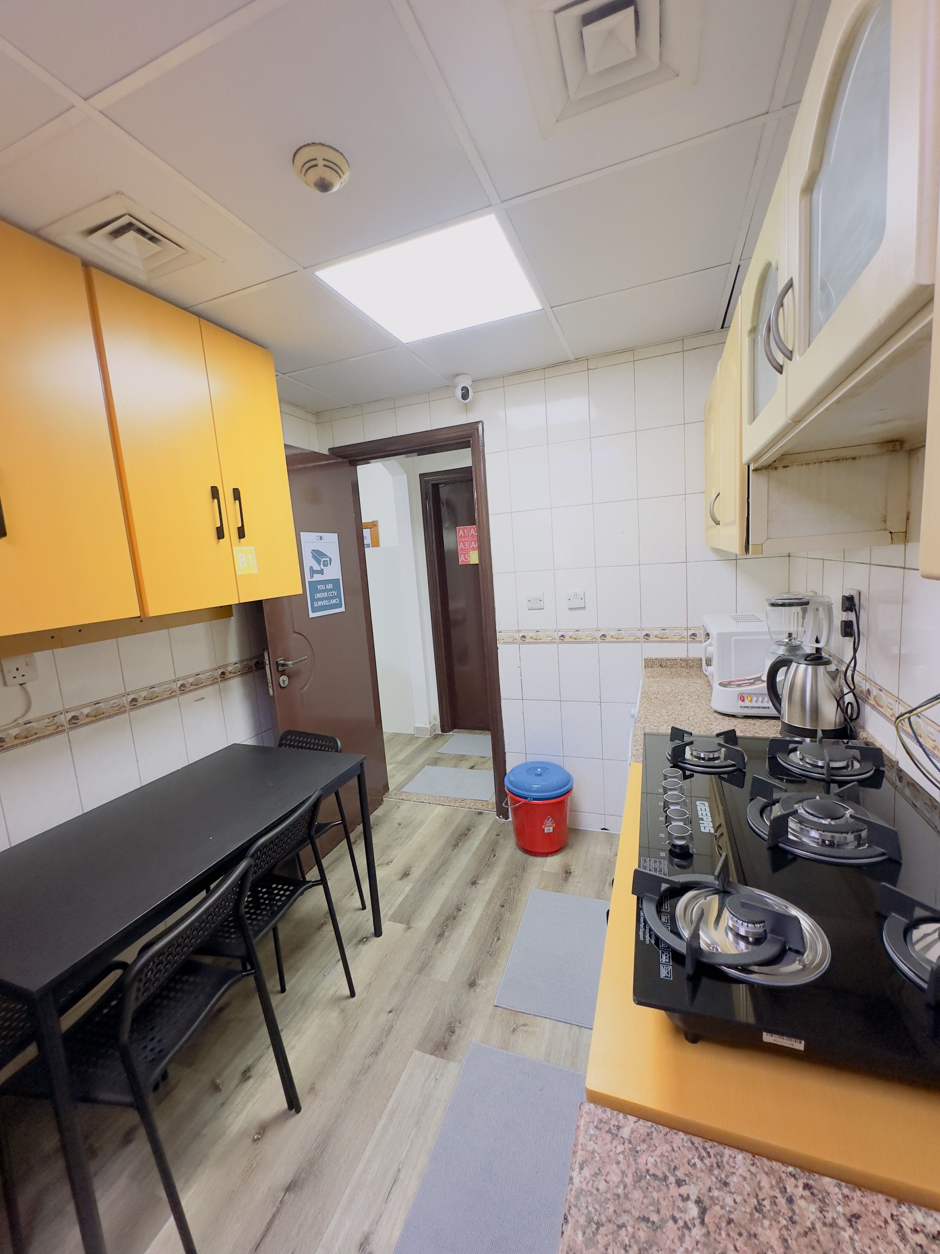 The apartment is fully equipped and has 12 separate cabins with two shared washrooms for 12 guests. AED 1400/- includes all costs and service charges, with no hidden fees, and includes the following amenities: